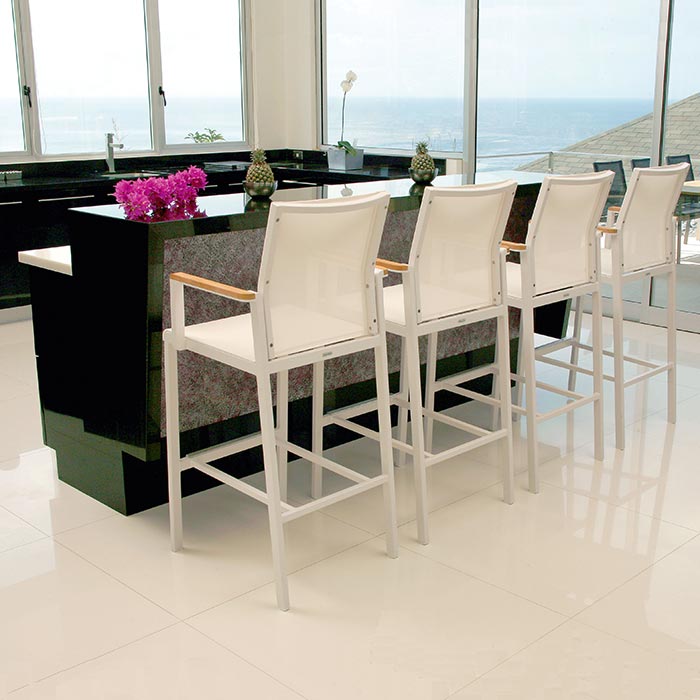 Lovely for use indoors, outdoors or even poolside, perfect for dining and leisure. These Aura high dining carver chairs have a foot bar to keep them sturdy and a protective cover that will resist marking. The arms of these sophisticated chairs are made from teak.