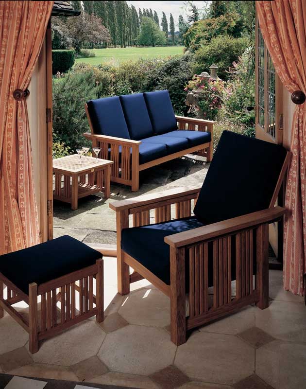 The Mission style of furniture comprises simple horizontal and vertical lines with flat areas to emphasize the grain of the wood. This has the multiple vertical struts with square profile but without looking heavy. Teamed with thick cushions for a luxurious look and comfort.