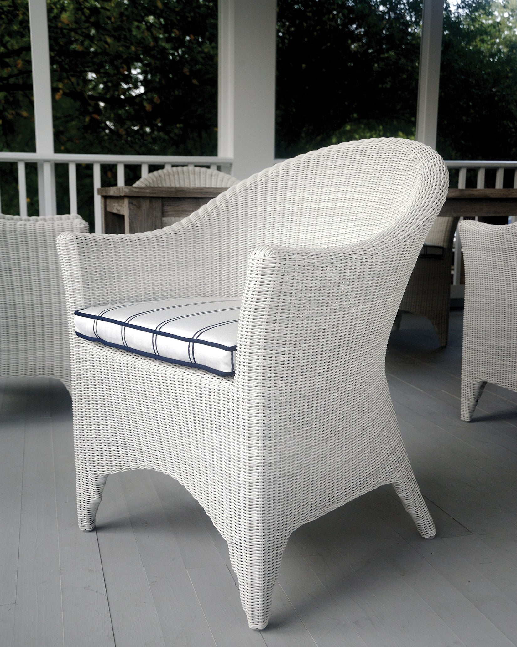 - Shown in White wicker and Topside Nautical fabric around Tuscany dining table