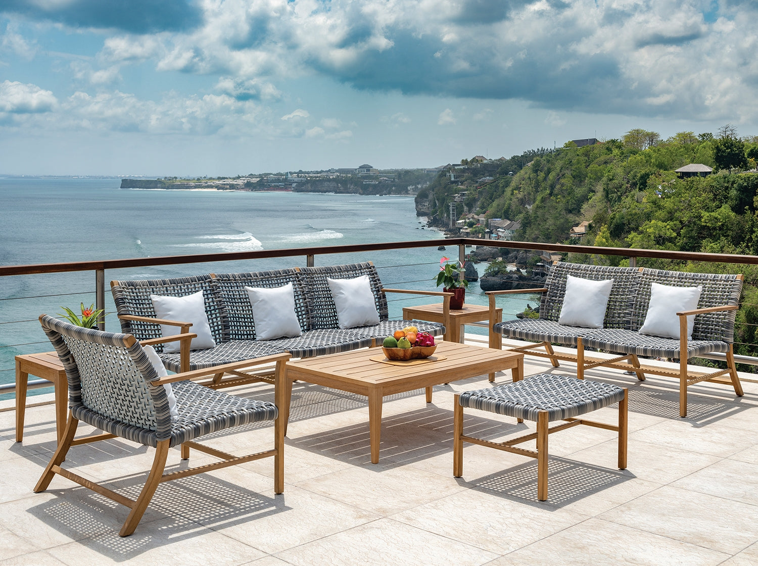 The Catherine Collection uses a classic blend of materials for a relaxed, elegant appeal. Extra-large wicker fiber is wrapped around a solid teak frame in a geometric, open-weave pattern. Wicker seating surfaces have just the right amount of give to make cushions unnecessary.