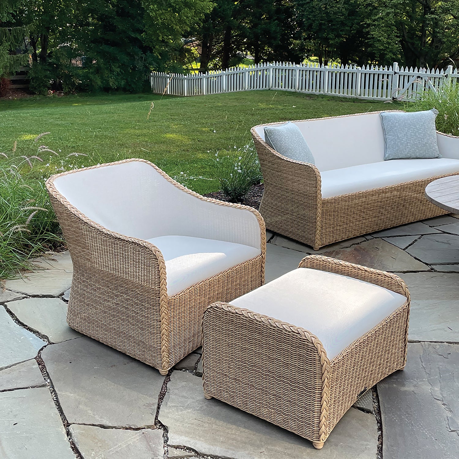 The Quogue collection combines all-weather wicker with a modern upholstered seating surface. This unique design eliminates the need for a cushion. Upholstered surfaces are made from durable, easy-to-care-for Batyline™ mesh. Seats are gently padded with quick-drying reticulated foam. They typically dry in as little as twenty minutes after rainfall.