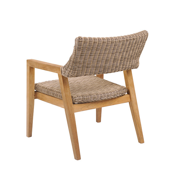 The Spencer Collection has a slender, modern design with mid-century flair. The seat and back are constructed from the finest all-weather wicker, eliminating the need for a cushion. Legs and arms are made from solid teak.
