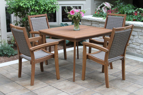 This all-weather resin wicker and eucalyptus hardwood armchair is made from sustainable, plantation-grown eucalyptus for long-lasting outdoor use and durability in all climates and is finished with a beautiful brown umber stain.