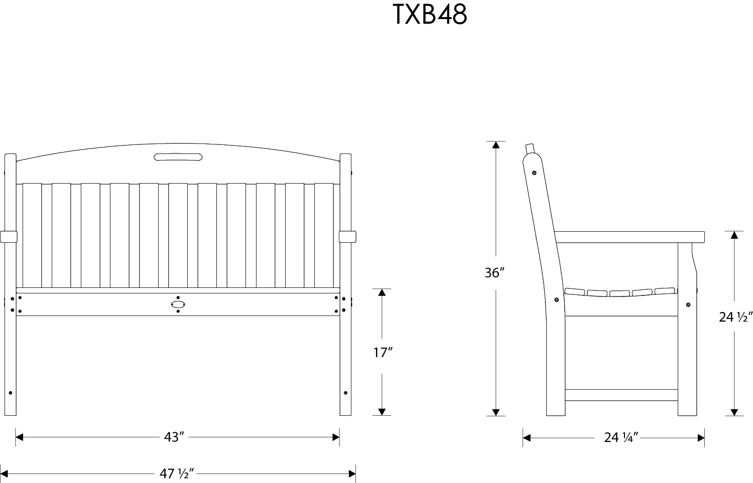 - Dimensions: 47.5"W x 24.25"D x 36"H; Seat: 43"W x 18"D; SH 17"; AH 24.5"; 57 lbs
